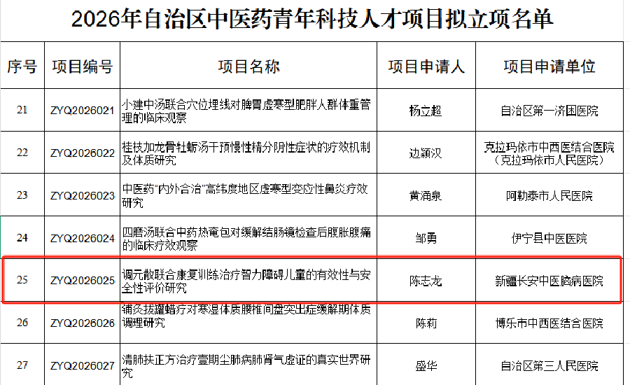 近日,新疆维吾尔自治区卫生健康委公布了2026年度中医药青年科技人才项目立项结果,新疆长安中医脑病医院申报的《调元散联合康复训练治疗智力障碍儿童的有效性与安全性评价研究》(项目编号:ZYQ2026025)获批立项。