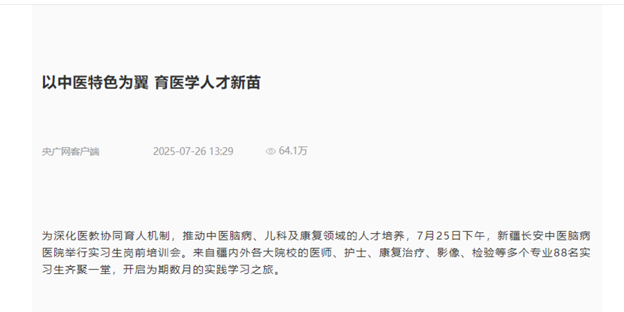 本次岗前培训会不仅标志着医院年度实习工作的正式启动,更展现了医院作为中医专科人才培养高地的责任担当。在中医文化与现代医学交融的实践中,新疆长安中医脑病医院正以扎实的培养体系与开放的协作平台,为青年医学人才的成长赋能,为中医药传承创新注入青春活力。