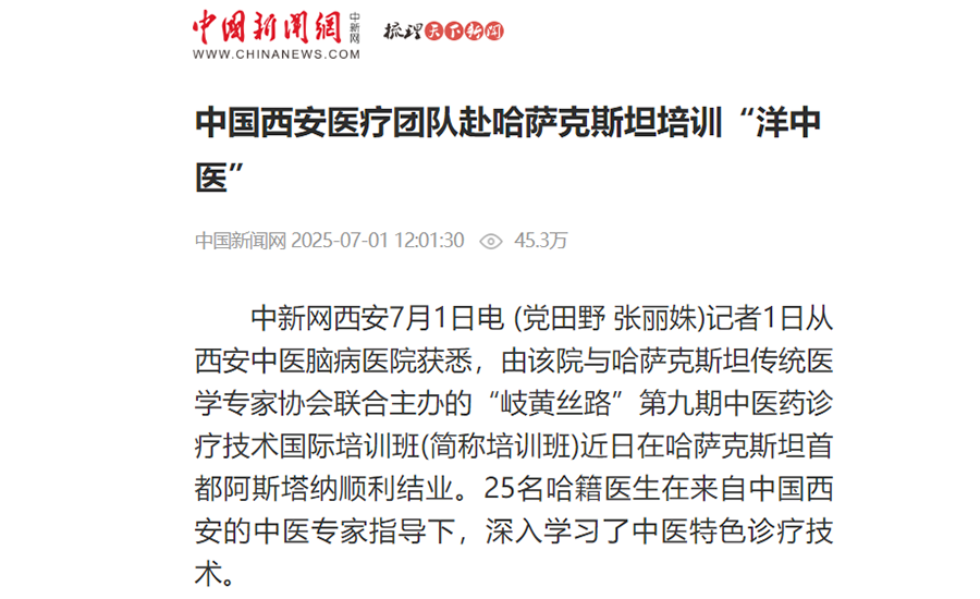 中新网西安7月1日电 (党田野 张丽姝)记者1日从西安中医脑病医院获悉,由该院与哈萨克斯坦传统医学专家协会联合主办的“岐黄丝路”第九期中医药诊疗技术国际培训班(简称培训班)近日在哈萨克斯坦首都阿斯塔纳顺利结业。25名哈籍医生在来自中国西安的中医专家指导下,深入学习了中医特色诊疗技术。