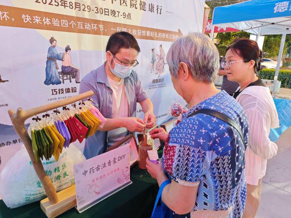 健康互动区则成了老少皆宜的"欢乐场"。100多道脑健康知识问答、趣味扎飞镖游戏引众人参与,闯关成功的家庭能一起DIY中药香囊,年轻朋友们则拿着赢来的养生锤打卡拍照,让健康科普多了份趣味。